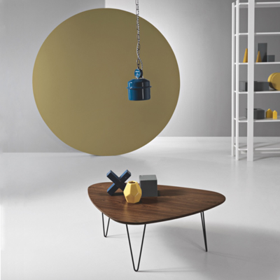 NICO moderner Couchtisch aus Holz mit lackierter Metallstruktur und geformter Platte.