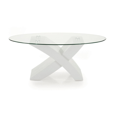 Wohnzimmer-Couchtisch Tito mit ovaler Glasplatte und Untergestell aus MDF-Holz.