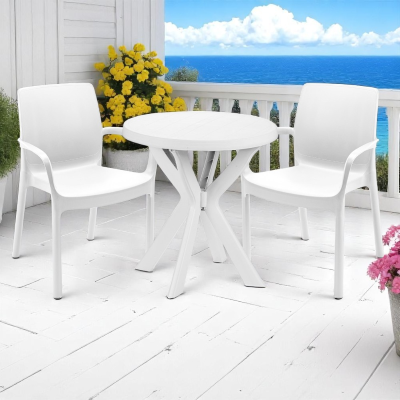 Der weiße runde Tisch ist die ideale Lösung für alle, die Funktionalität, Eleganz und Widerstandsfähigkeit in einem einzigen Outdoor-Möbelstück vereinen möchten. Er besteht vollständig aus Polypropylen, einem Material, das für seine Robustheit, Wasserfestigkeit und einfache Reinigung bekannt ist, und eignet sich perfekt für den täglichen Einsatz im Freien – selbst bei Sonne, Regen oder Feuchtigkeit.