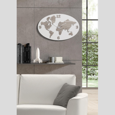 Planisphere ovale Wanduhr im modernen Stil, aus laminiertem Holz graviert und lasergeschnitten.
