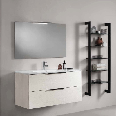 The bathroom cabinet is; consisting of a base with structure and drawers in wood effect melamine, ceramic sink and polished edge mirror with LED lamp.