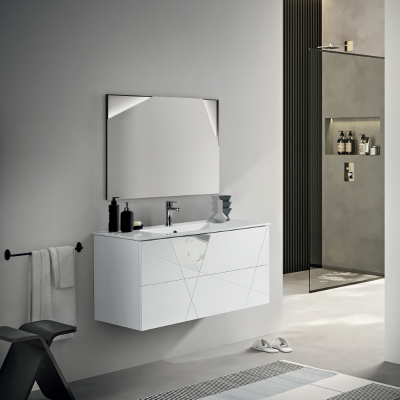 The bathroom cabinet consists of a base made of lacquered MDF, chipboard drawers coated in PVC, MDF fronts with geometric decorations and Laminam marble inserts.