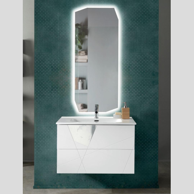 The bathroom cabinet consists of a base with a lacquered MDF structure, chipboard drawers covered in PVC, MDF fronts with geometric decorations, and Laminam marble inserts.