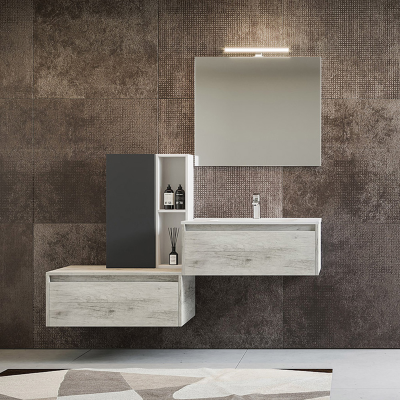 The composition includes a basic module with drawer and flat sink, a lower basic module with a 82 cm drawer and a panoramic mirror with LED lamp included.