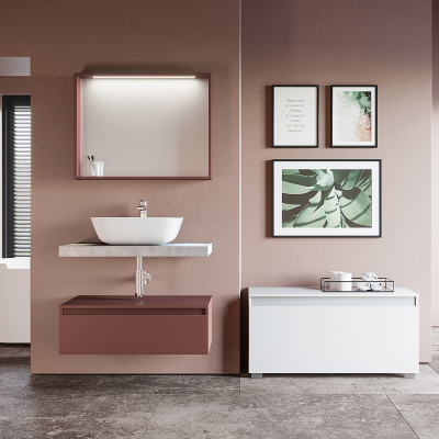 Ninfa bathroom cabinet composed of spatulated gray top, module with 80 cm drawer, Matt Rust color, ceramic countertop washbasin and quadrant mirror with LED bar.