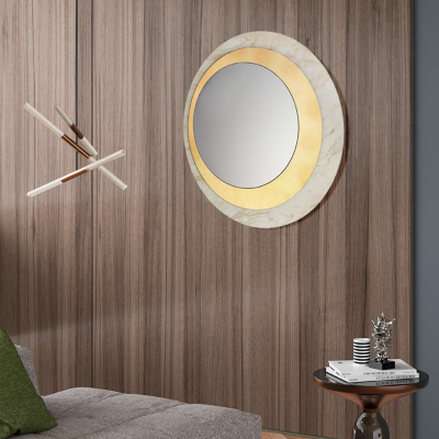 The play of shapes and materials that characterizes this mirror makes it almost resemble portions of the moon, perfect for livening up any type of room.
