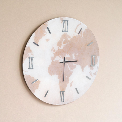 Made of tempered glass with a geographical map drawn and embellished with Roman numerals and high-contrast hands.