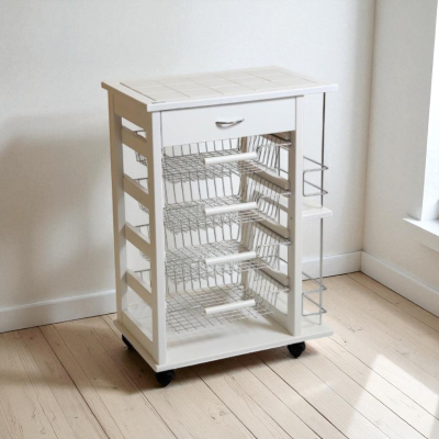 Kitchen fruit trolley in beech wood, equipped with a countertop with ceramic tiles, 4 fruit baskets in chromed steel and 1 drawer for storing kitchen utensils.