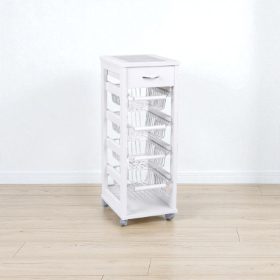 Space-saving kitchen trolley with drawer, 4 fruit baskets in chromed steel.
