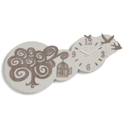 Wall clock in a modern style, made of laminated wood engraved and laser cut.