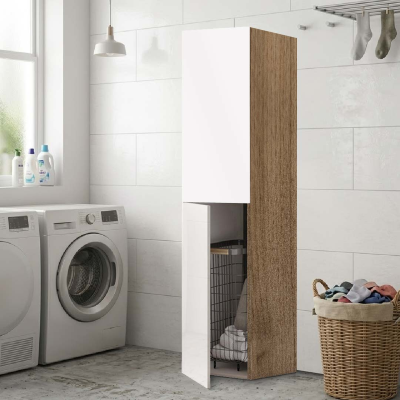 Columna multiusos de 2 puertas blancas y estructura de nogal con carro de lavanderíaColumna multiusos de 2 puertas blancas y estructura de nogal con carro de lavanderíaColumna multiusos de 2 puertas blancas y estructura de nogal con carro de lavandería