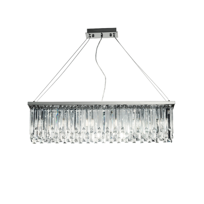 Lámpara de suspensión rectangular de 6 luces, en metal cromado con elementos decorativos en cristal tallado y cables de longitud regulable. .