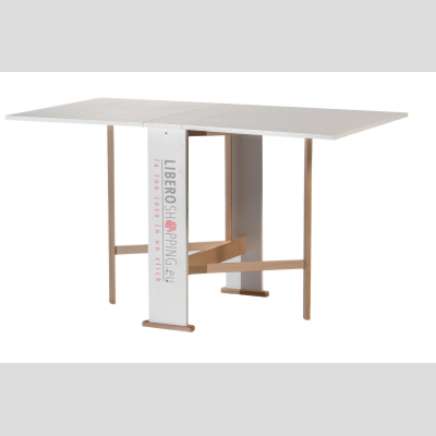 Tablero equipado con dos extensiones laterales que se pueden levantar para obtener una mesa entera o solo un tablero.Para apoyar los dos tableros encontramos las patas de haya que no son visibles cuando la mesa está cerrada