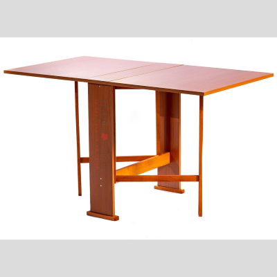 Tablero equipado con dos extensiones laterales que se pueden levantar para obtener una mesa entera o solo un tablero.Para apoyar los dos tableros encontramos las patas de haya que no son visibles cuando la mesa está cerrada