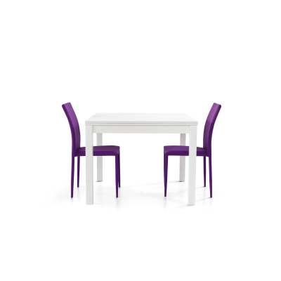 Table carrée en bois mélaminé avec plateau finition blanche et pieds avec semelles intérieures en plastique anti-rayures.