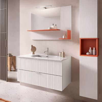 Meublez votre salle de bain avec style en choisissant la collection LYRA où l'élégance et la polyvalence de la façade nervurée transforment chaque salle de bain en une oasis. de style et de raffinement. Le charme de la façade nervurée s'associe à l'élégance du lavabo en céramique, pour créer un environnement d'une beauté raffinée et fonctionnelle.
