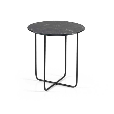 Table basse ronde moderne JON avec base en métal peint en noir et plateau en verre feuilleté effet marbre noir.