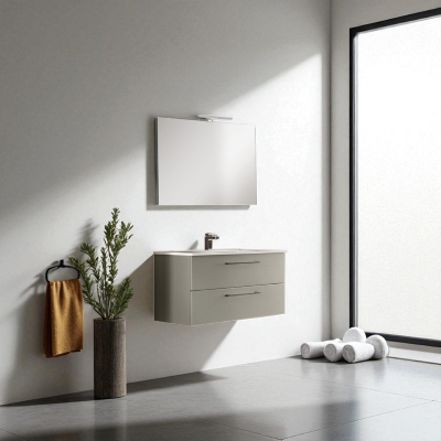 La composizione del bagno MAYA1 prevede un modulo base sospeso con lavabo in ceramica dotato di 2 cassettoni in legno con apertura ammortizzata e chiusura soft closing e lo specchio con lampada LED.