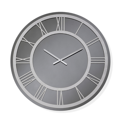 L'orologio da parete ETHAN in cristallo Fumè con cornice a rilievo Argento e lancette e numeri romani Argento è una fusione di eleganza e stile contemporaneo.