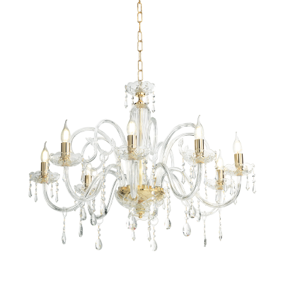 Lampadario a sospensione MARIATERESA realizzata in vetro lavorato a mano liscio con finiture oro e pendenti in cristallo trasparenti.