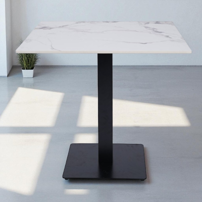 La superficie del tavolo misura 80x80 cm è resistente e facile da pulire. La base così come la gamba centrale è realizzata interamente in metallo antracite per offrire un supporto altamente stabile e solido sia alla struttura che al piano d’appoggio, anche in caso di uso professionale intensivo.