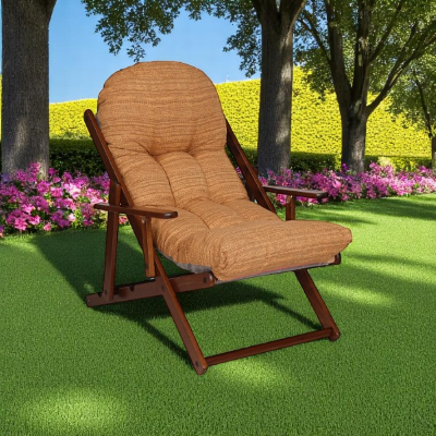 Poltrona Sdraio da giardino in legno di abete tinto noce,facilmente richiudibile e trasportabile,regolabile in 3 posizioni.Cuscino in policotone,imbottito in spugna triturata,facile da rimuovere e pulire.